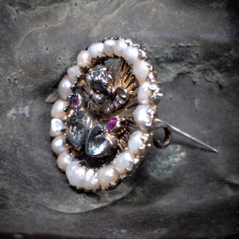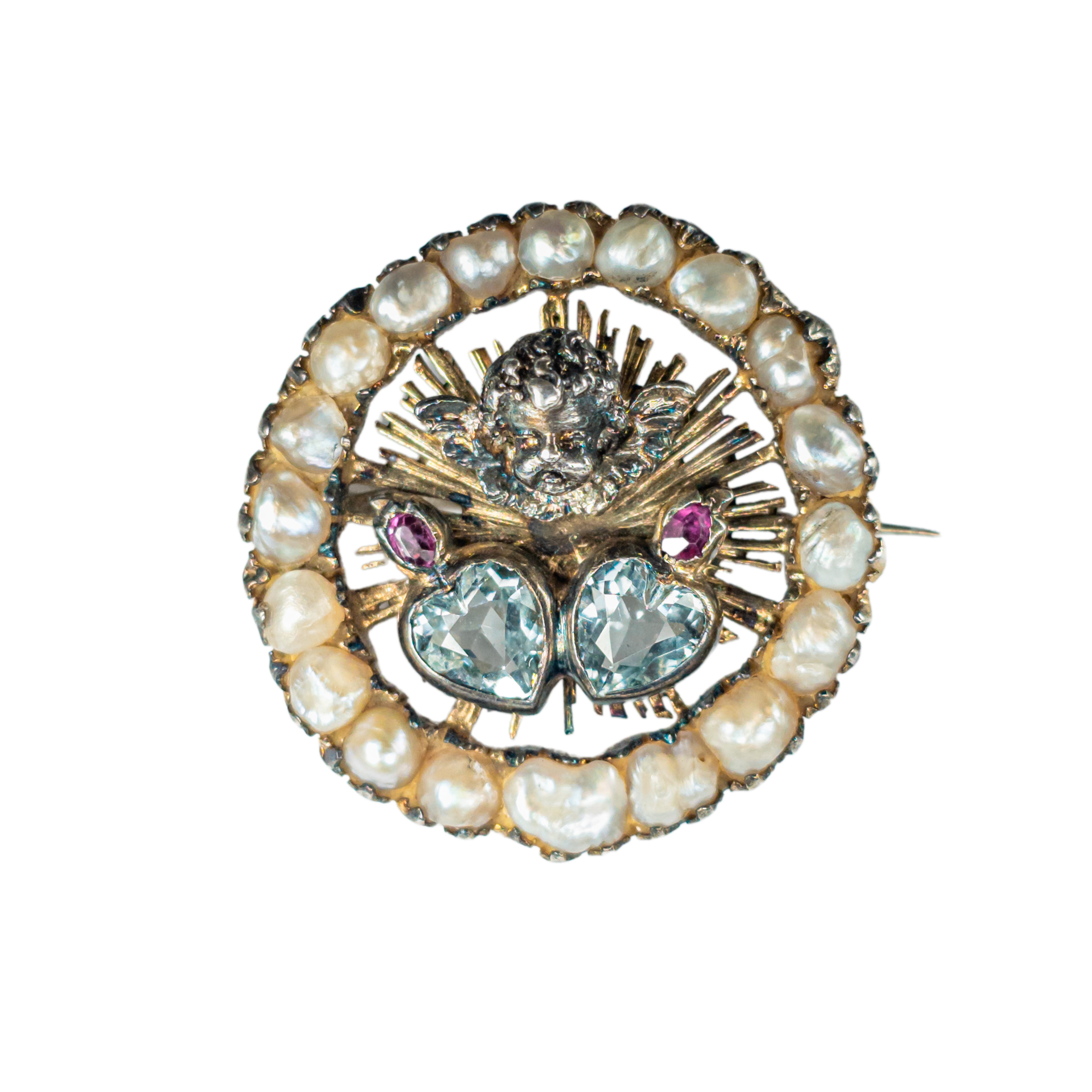 Charming early 19th century lovers brooch, set with 2 aquamarine hearts and each with a flame coming out of the the top of the hearts, the flame represented by a ruby stone. Above the hearts in silver guilt is a winged cherub’s head with a sunburst behind it, the brooch is set with a row of fresh water pearls around the outer rim of the brooch, all in all a lovely lovers gift, beautifully executed in silver guilt around 200 years ago, a great Valentine’s gift from a lover to his love.