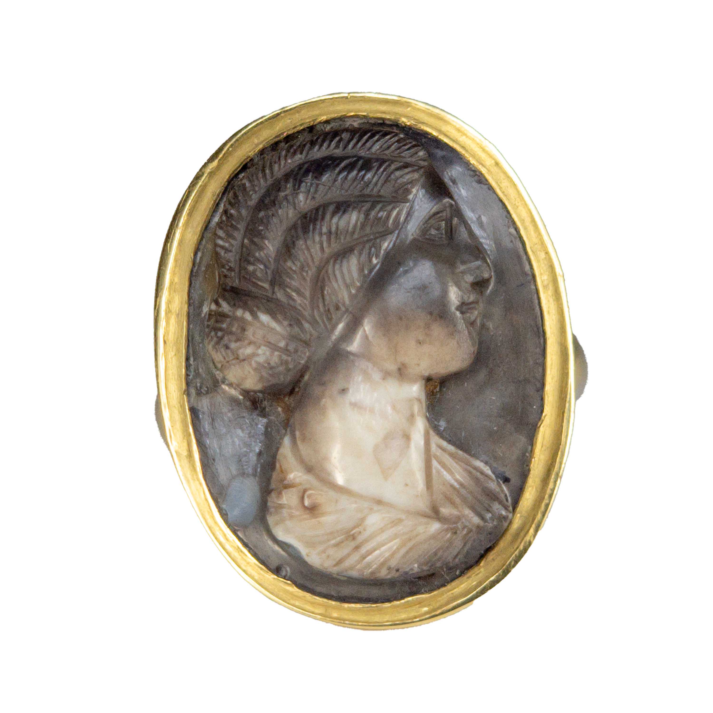 A Larger than usual cameo portrait of Empress Faustina the younger dating to the 2nd century AD, wife of the Emperor Marcus Aurelius, she was born in 130 AD and died in 175 AD aged 45, the cameo is also unusual as it is carved in a black to white agate.