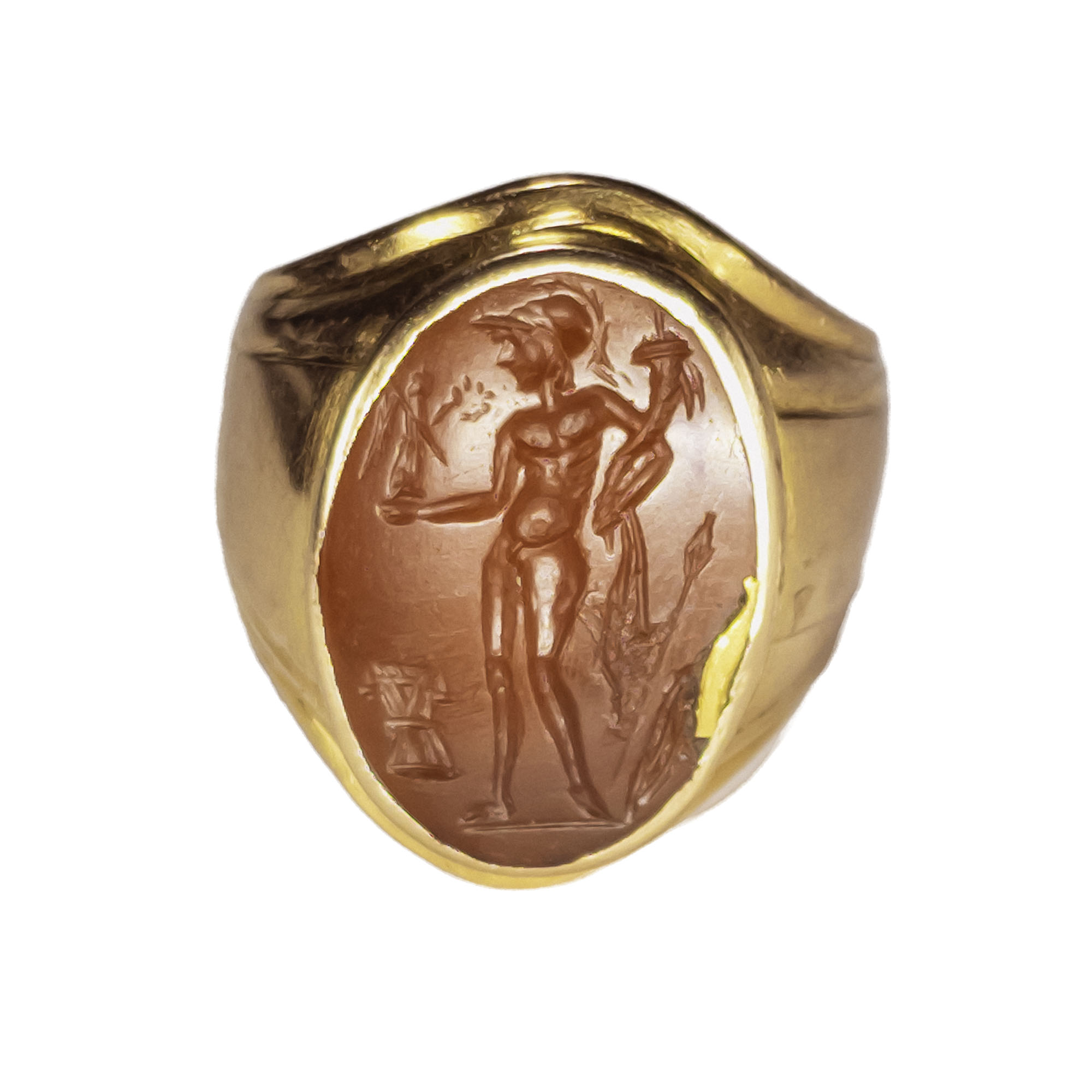 Ancient carnelian intaglio of Mars with helmet and cornucopia in one hand and figure of Victory in the other, set in a later gold ring dating from the 19th century.