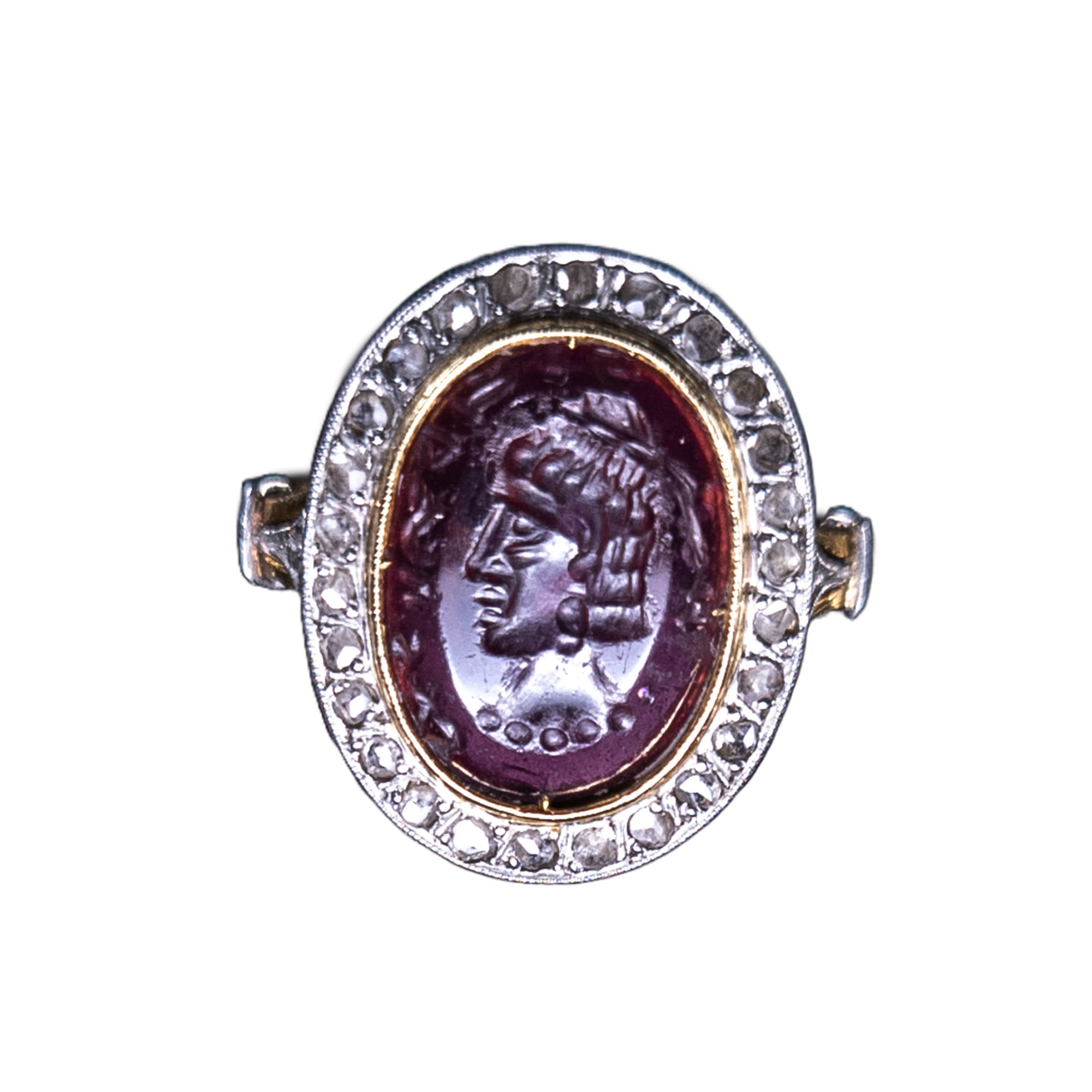 A garnet intaglio of a Sasanian king circa 6th to 7th century A.D carved into a pinkish garnet and set in a late 19th-century gold and diamond ring, The name of the king is inscribed around the edge of the stone in Pahlavi. The ring is in excellent condition.