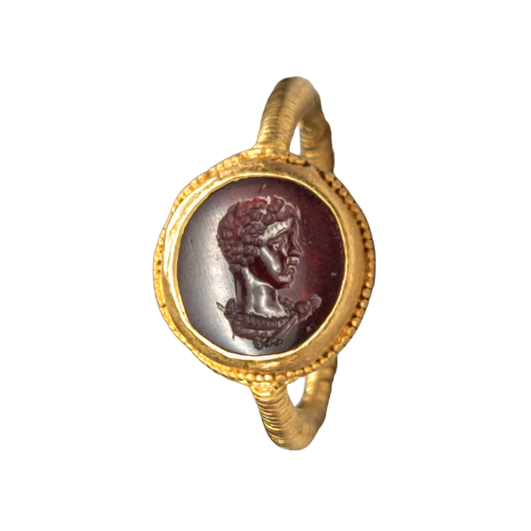 A Roman intaglio in carnelian of an unidentified young man or deity, probably a young Hercules. The intaglio stone is set in its original twisted gold wire ring and dates to around the second century AD.