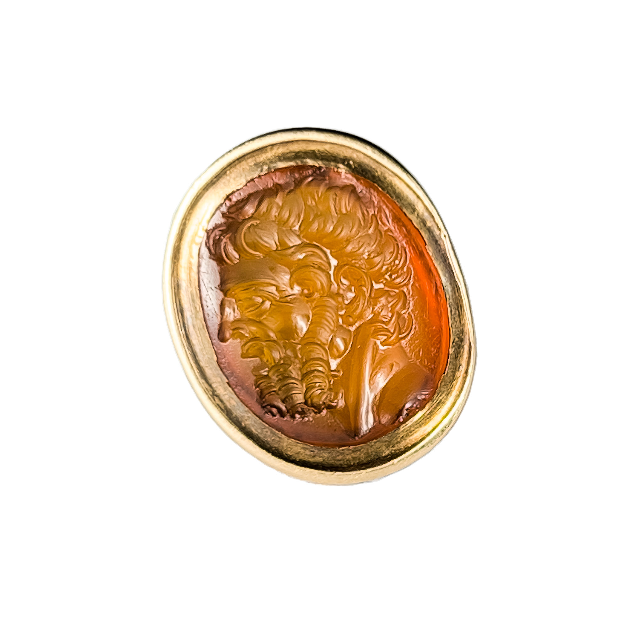A late 18th to early 19th century gold fob seal of small size with an engraved carnelian stone of a head of a Greek actor or orator dating to the 1st to 2nd century BC. The carving of this intaglio is remarkable in that the skill of the engraver has captured the subject in full swing of his speech with mouth open and the tension in the muscles of the face particularly around the eyes. The amount of emotion the engraver has captured is superb for a stone of such small size.