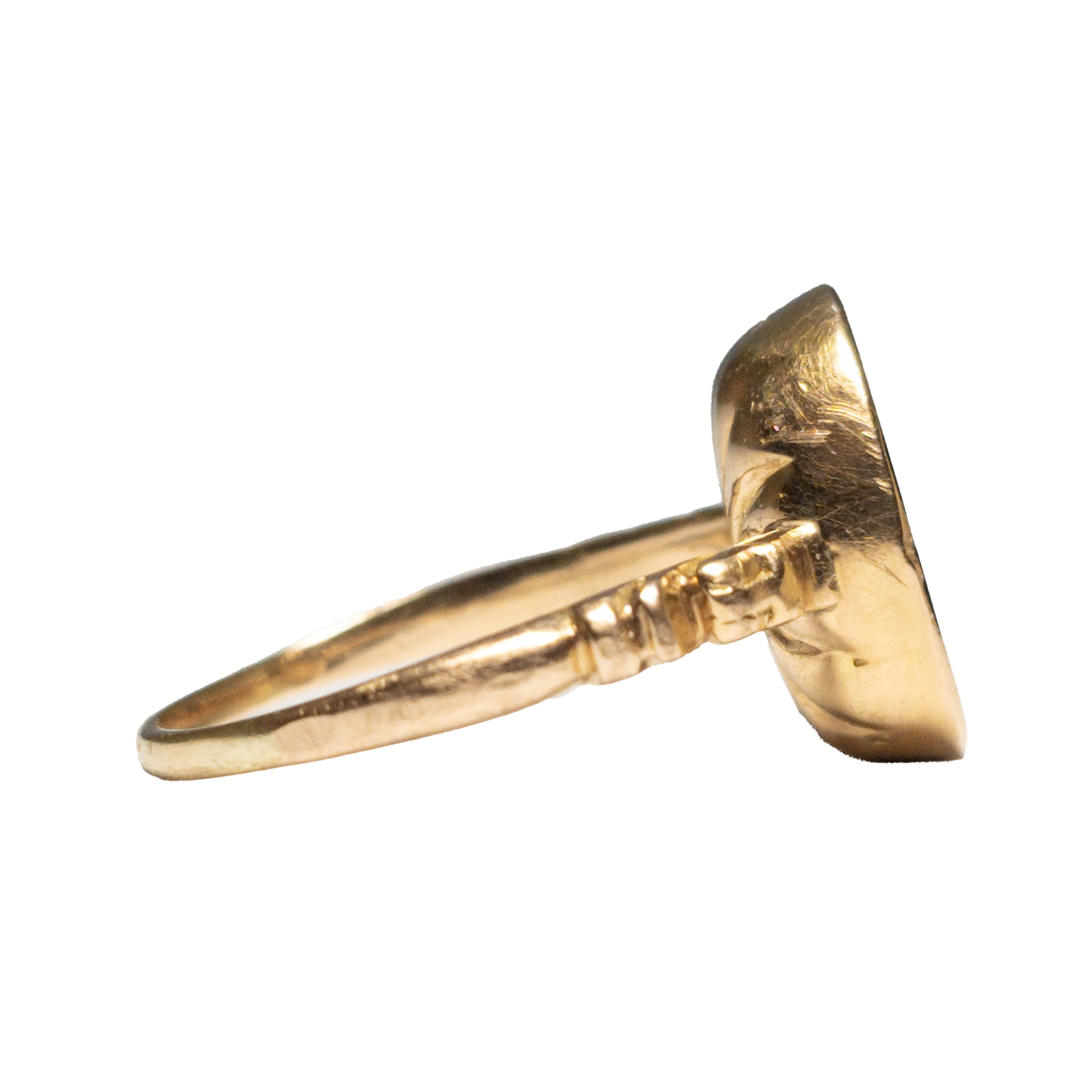The intaglio is flanked by a round-cut vivid yellow diamond on one shoulder and a pale green square-cut diamond on the other. The inner shank bears the stamp "FM," presumably the maker's mark, and "750" for 18 carats gold.
