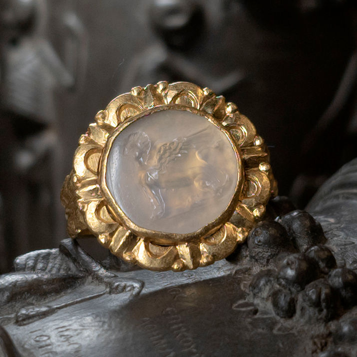 A very fine Roman intaglio of a sphinx in white chalcedony depicted laying down facing left, the sphinx has its characteristic eagle wings, snake tail, lion body and female human head, carved with very fine detail and it is set in its original gold ring dating to the 1st to 2nd century AD.